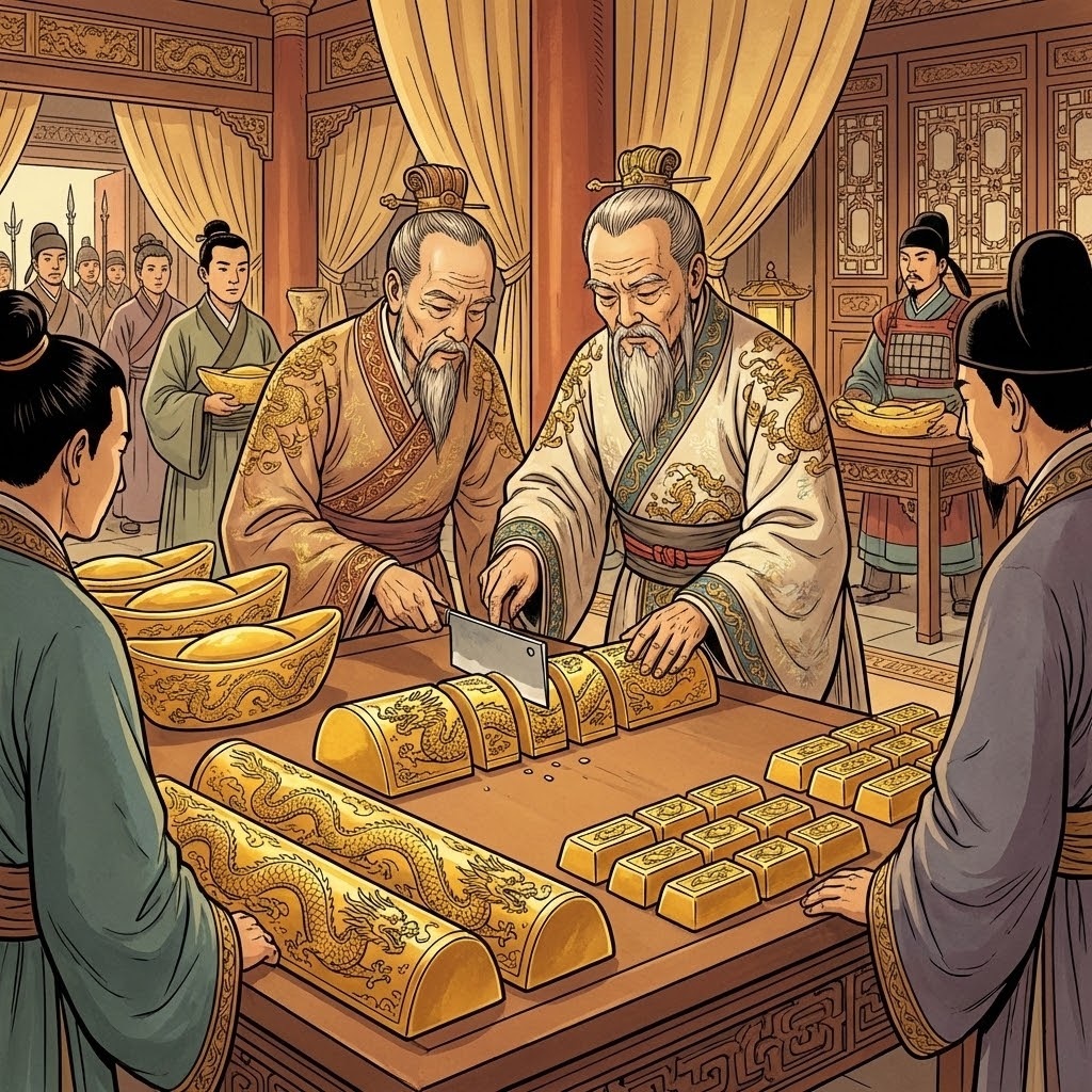 Tijdens de Chinese dynastie zijn er gouden staven met draken motief. Een heer verdeelt elke goudstaaf in 5 gelijke stukken.