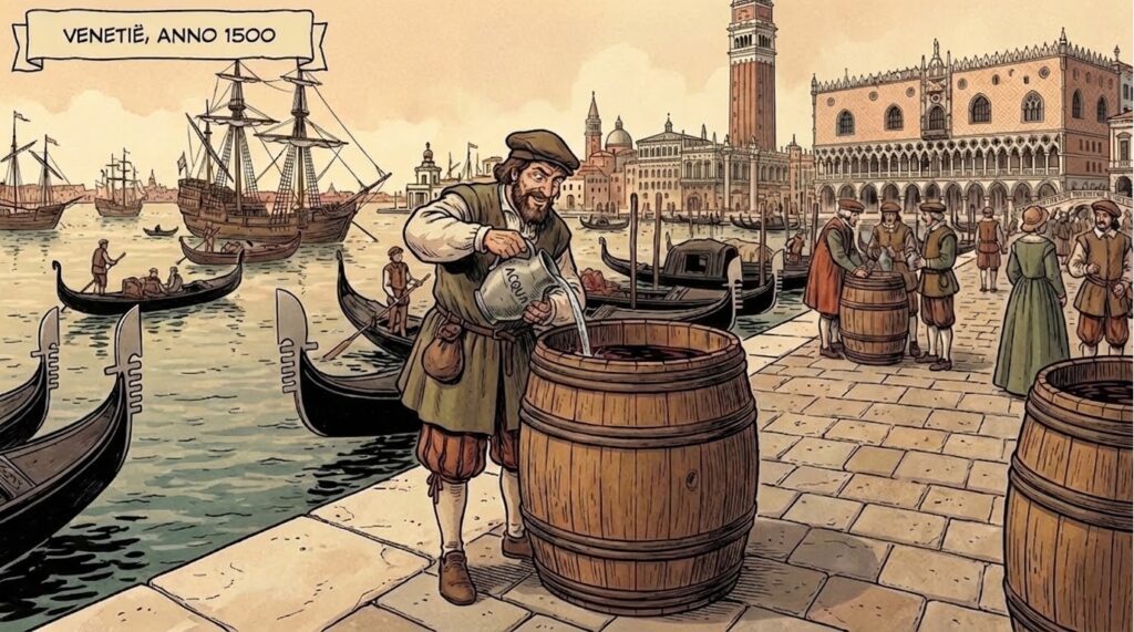 In de haven van Venetië rond 1500 mengt een koopman wijn voor de handel.