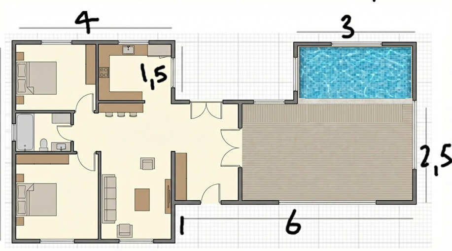 4c) Fremuz tekent een zwembad (het blauwe deel). Als deze 2 meter diep is. Hoeveel liter water past er dan in het zwembad?