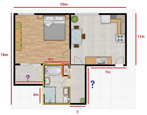 Hieronder zie je de plattegrond van het nieuwe huis van Albert. Alleen heeft hij wat koffie gemorst op de kaart. Hierdoor zijn niet alle afmetingen goed te lezen. Er staan nu blauwe en paarse vraagtekens. De muren zijn 3 meter hoog.