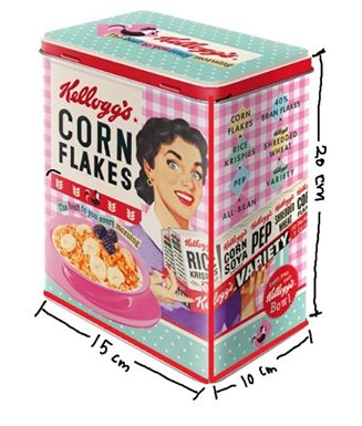 Deze cornflakesblik heeft een afmeting van 20cm hoog, 15 cm breed en 10 cm lang. Het is gemaakt van 520 gram tin en staat in de keuken bij elke tante. Als de cornflakes op zijn, wordt het blik vaak gebruikt om andere dingen in op te bergen.