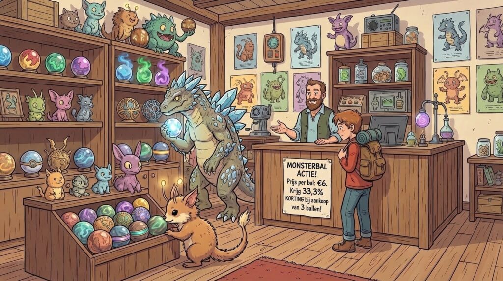 Je krijgt 33,3 % korting op een monsterbal wanneer je er drie tegelijk koopt. Hoeveel betaal je als een monster €6 per stuk is.
