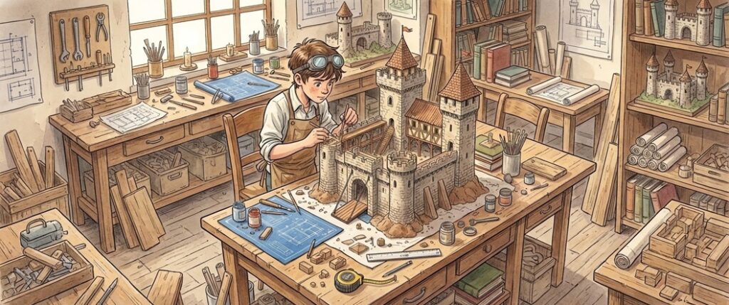 Een leerling bouwt een model van een kasteel. De schaal is 1 : 100. Dat betekent: